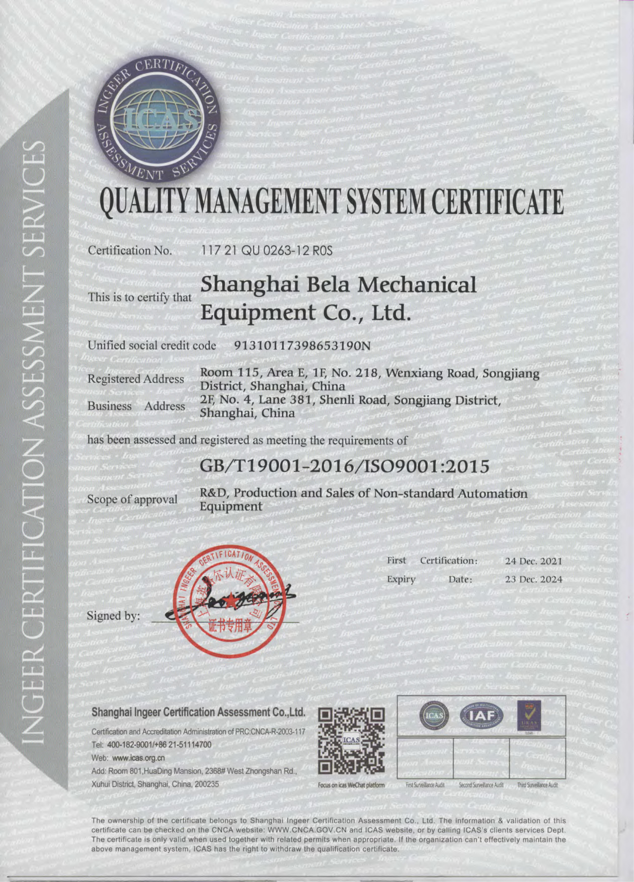 质量管理体系认证证书